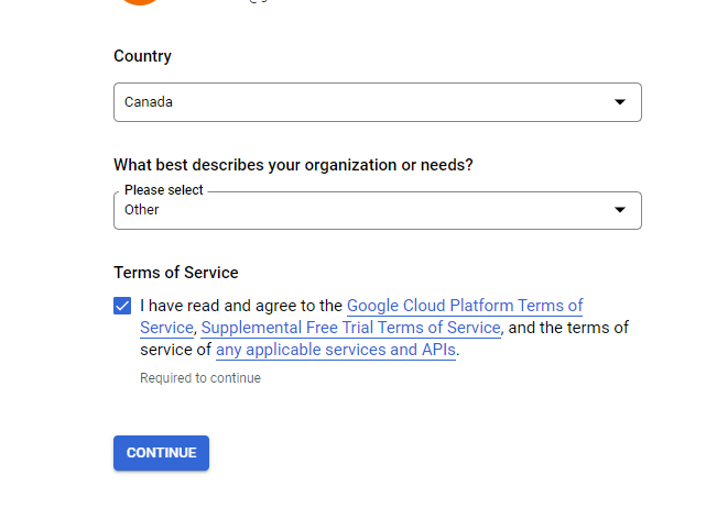 3. Ensure your country is correct. Under “What best describes your organization or needs?“ Click the drop down and select “Other” at the very last option then click the agreement for “Terms of Services”.