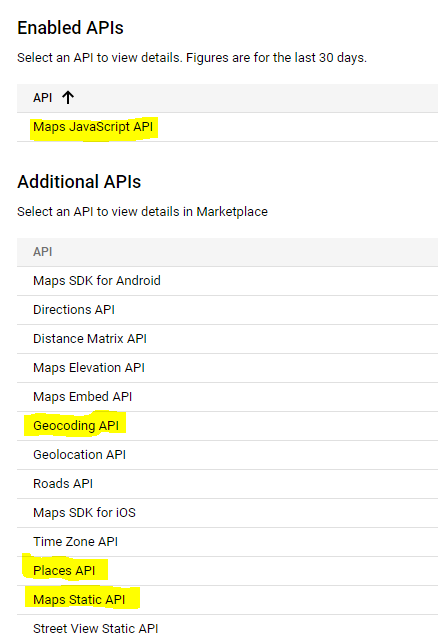 11. You will be redirected and see a section called “Additional APIs” there are four things to enable in total Maps JavaScript API, Geocoding API, Maps Static API, and Places API. Repeat step 10 and click enable for each.