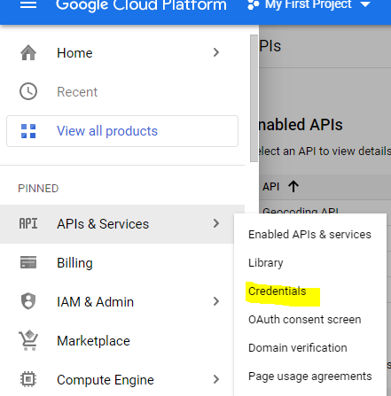 12. Click back on the Hamburger menu on the top left and under APIs & Services click “Credentials“.