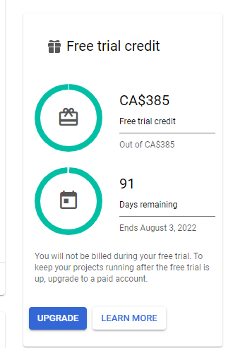 15. Before implementing the Key to your website, go back to the menu and click “Billing” it will direct you to your Billing Account Overview area scroll down and under “Free Trial Credit“ click “Upgrade“ then “Activate”.