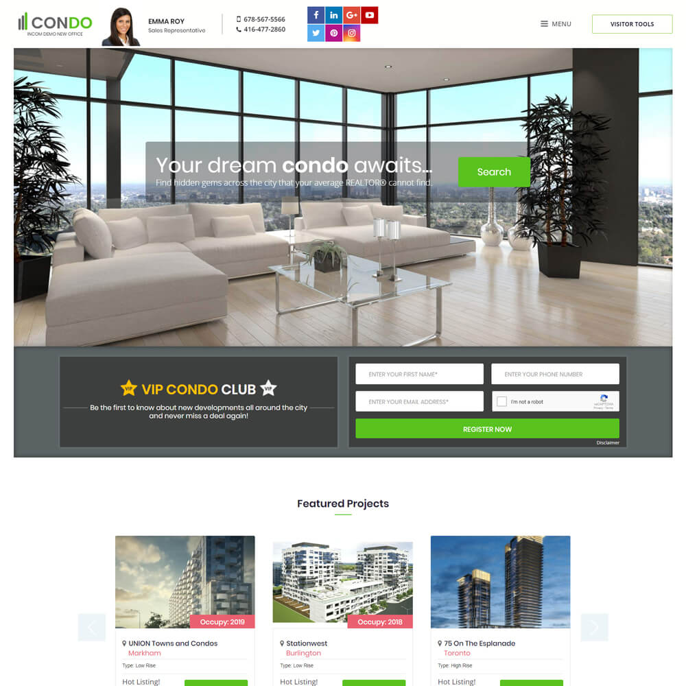 Class: Premium Premium themes are an additional $4.95/m. This grants you access to ALL Premium website designs that add a modern spin to your real estate website. Plus, you can jump from one theme to another.Want to focus your business on targeting pre-construction condo buyers in your local area? No problem. Step up your game and show your competition how it's done. Stand out from the growing crowd and place the spotlight on you with a website that focuses on listings unavailable anywhere else!