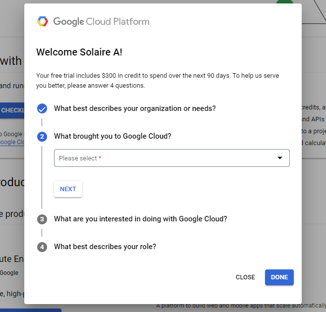 1. Go to www.cloud.google.com, sign into your personal Gmail account.