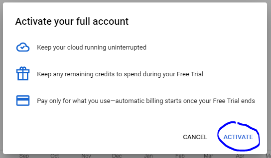 15. Before implementing the Key to your website, go back to the menu and click “Billing” it will direct you to your Billing Account Overview area scroll down and under “Free Trial Credit“ click “Upgrade“ then “Activate”.