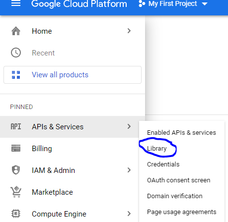 9. You will now be redirected to the cloud platform console page. From the left side menu click “APIs & Services” then “Library”.