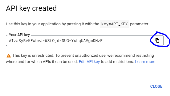 14. It will generate a API key, click to Copy that Key.
